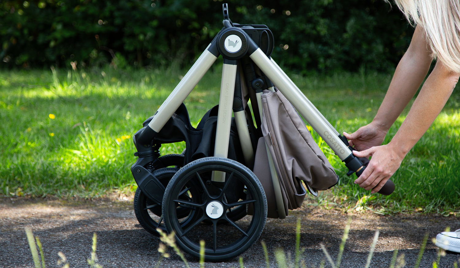 Kein Stress: Giggle 4 lässt sich ganz easy mit aufgesetztem Sitz in beide Richtungen zusammenfalten – super praktisch für unterwegs und zum Verstauen. Die ergonomische Babywanne mit einfachem Klick-Release eignet sich für gelegentliche Übernachtungen, sodass dein Baby bequem und stilvoll reisen kann.