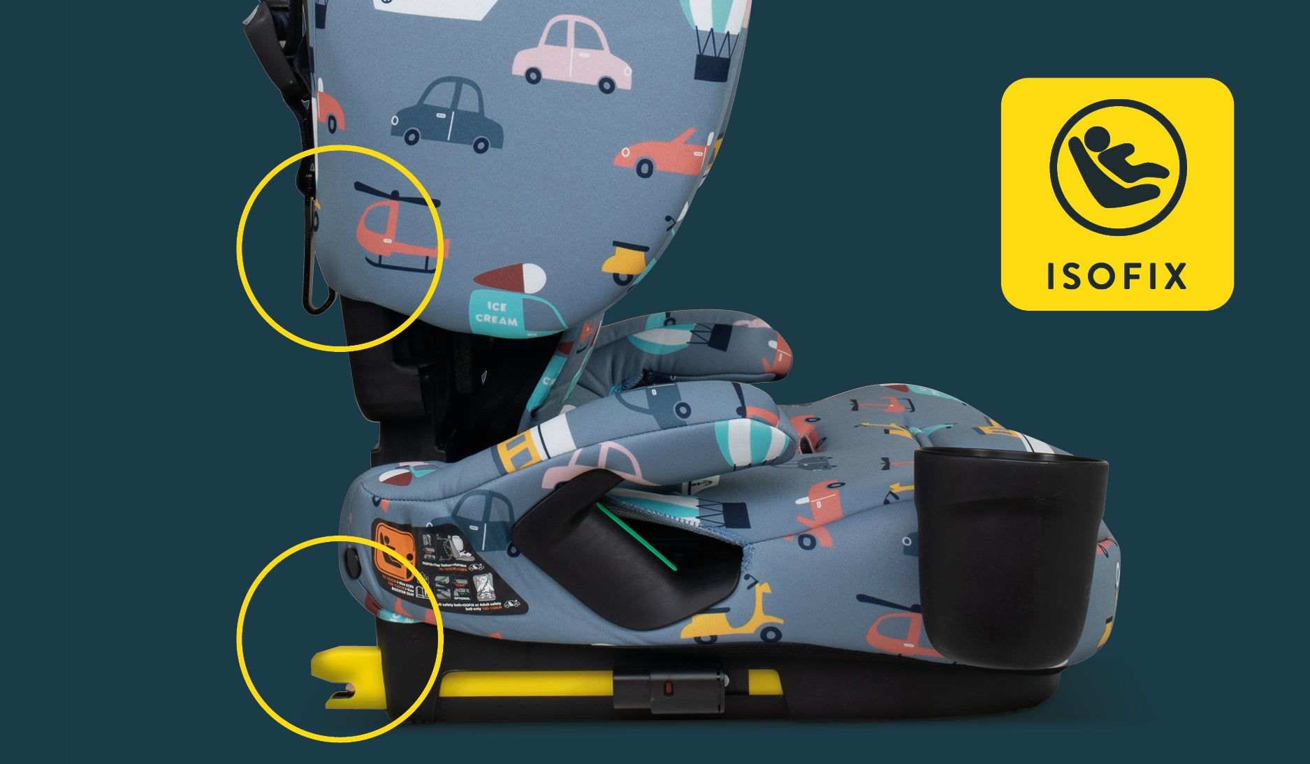 Der On the Go i-Size hat ISOFIX-Befestigungen (die Dinger, die das Ding bombenfest machen) und einen Top-Tether für Extra-Halt. Der 5-Punkt-Gurt verteilt die Kräfte im Falle eines Aufpralls clever auf die stabilsten Körperstellen. Bis 20 kg mitwachsend. Mit Seitenaufprallschutz, dick gepolsterter, verstellbarer Kopfstütze und rutschfesten, energieabsorbierenden Brust- und Bauchpolstern. Sogar gepolsterte Armlehnen sind dabei – Komfort deluxe!
