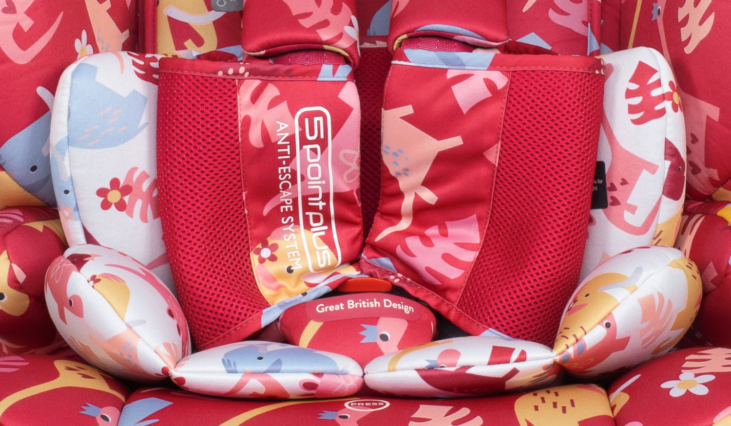 - Schnell lösbarer 5-Punkt-Gurt mit rutschfesten Brust- und Bauchpolstern